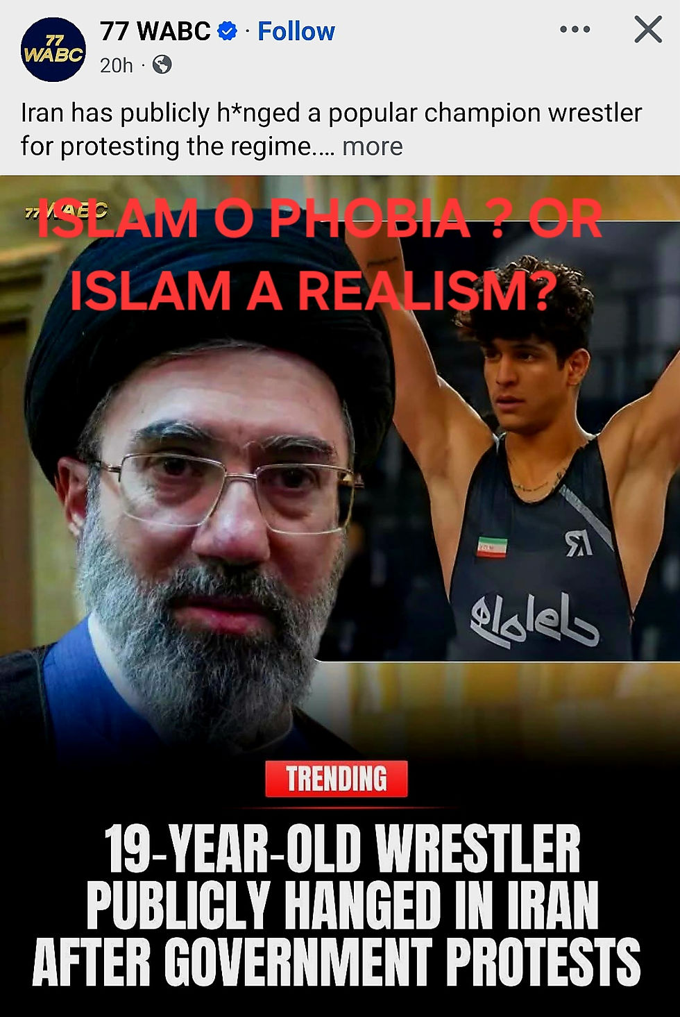 19 year Old WRESTLER HANGED IN IRAN FOR PROTESTING (is this ISLAM-A-PHOBIC ? or ISLAM-A-REALISTIC ?) https://www.themirror.com/sport/other-sport/iran-executes-athlete-donald-trump-1748378 The BUTCHERS OF IRAN the AYATOLLAS DEATH CULT CONTINUES .
